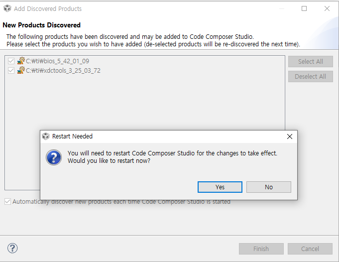 다시 Add Discovered Products 라는 창이 나타나고 Finish를 누르게 되면 CCS를 재부팅 해야한다는 메세지가 뜨게 되며 재부팅 후에 에러가 발생하였던 프로젝트파일을 빌드하게 되면 에러가 사라지게 됩니다.
