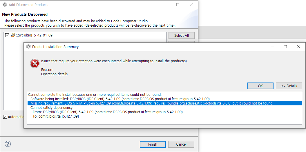 1. (Issue) This project was created using a version of DSP/BIOS tools that is not currently Installed: 5.42.1.09. Please Install the DSP/BIOS tools of this version, or migrate the project to one of the supported versions.